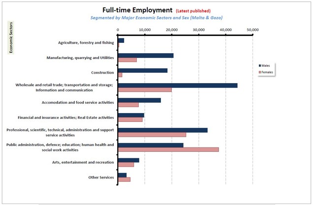 1.7 Full-Time Employment as at end August 2025Full-time employment as at end August 2025 stood at 298,738 persons - 280,552 employed in Malta and 18,186 employed in Gozo. 82% of full employment is recruited by the Private sector while the remaining 18% are recruited in the Public Sector. The total number of self-employed persons have an 11% share of full-time employment. The largest share of employment (21.5%) is recruited within the Wholesale and Retail; transportation and storage; information and Communication, followed closely by the Public Administration, Defence; Education; Human Health and Social Work activities sector at 20.6% and by the Professional, scientific, technical, administration and support service activities sector at 20% . |