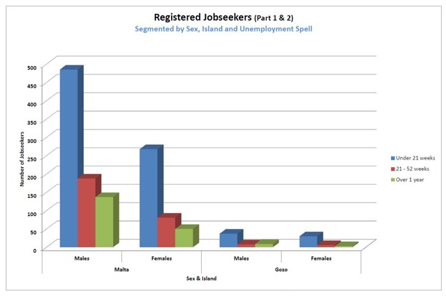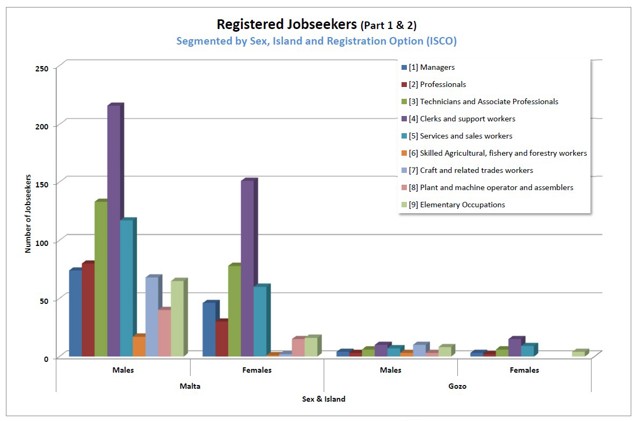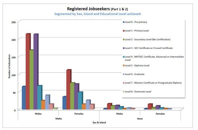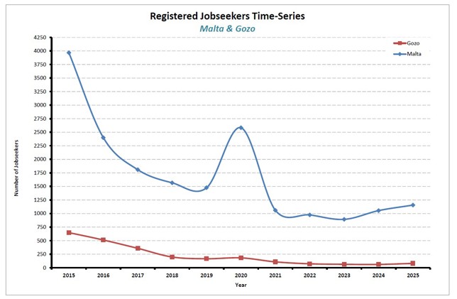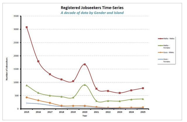 Over the past decade, the shares between the sexes remained the same having Malta males occupying a share of 63% of total registered jobseekers and females having a share of 27%; whilst those in Gozo occupy a share of 7% and 4% respectively. The percentage share of total unemployment in Malta and Gozo for 2025 is 93.5% and 6.5 % respectively. However, both islands have registered a significant drop-in unemployment. |