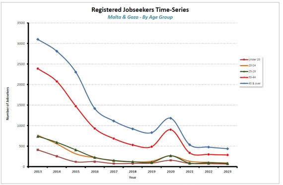 1.2 Registered Jobseekers Segmented by Age Cohorts (2014-2024)The largest age cohort of registered jobseekers at Jobsplus is that of the 45 years and over (40%), followed by those aged between 30-44 years (34%). Youth unemployment (under 25 years) averaged 14% of total registered jobseekers over the past decade. Over the past decade all age cohorts registered a drop. The largest drop was registered in the under 25-29 years cohort (-87.3%); then from 45 years and over cohort (-84.1%); followed by the 30-44 years cohort (-81.7%); then from 20-24 cohort (-79.6%) and finally by Under 20 years cohort (-60.6%).