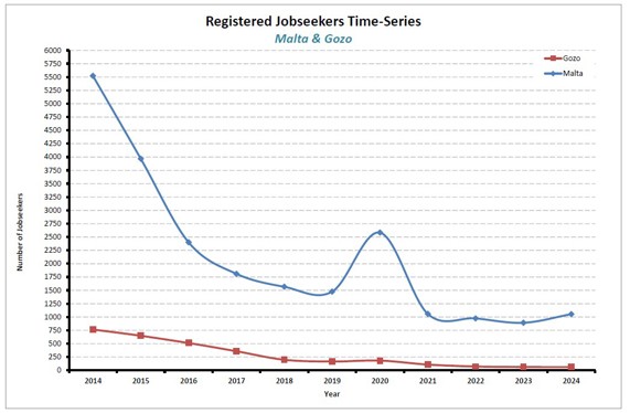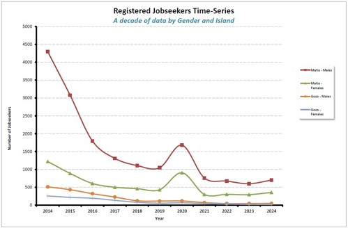Over the past decade, the shares between the sexes remained the same having Malta males occupying a share of 64% of total registered jobseekers and females having a share of 26%; whilst those in Gozo occupy a share of 7% and 4% respectively. The percentage share of total unemployment in Malta and Gozo for 2024 is 94.5% and 5.5 % respectively. However, both islands have registered a significant drop-in unemployment. |
