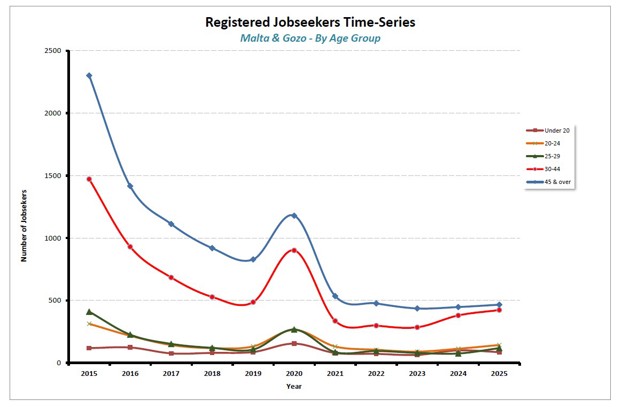 1.2 Registered Jobseekers Segmented by Age Cohorts (2015-2025)The largest age cohort of registered jobseekers at Jobsplus is that of the 45 years and over (38%), followed by those aged between 30-44 years (34%). Youth unemployment (under 25 years) averaged 14% of youths over the past decade. Over the past decade all age cohorts registered a drop. The largest drop was registered in the under 45 years and over years cohort (-79.8%); then from 30-44 cohort (-71.3%); followed by the 25-29 years cohort (-71.2%); then from 20-24 cohort (-54.3%) and finally by Under 20 years cohort (-27.1%).