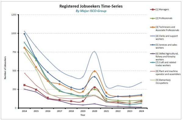 1.3 Registered Jobseekers segmented by Occupation (2014-2024)The majority of jobseekers registering with Jobsplus are looking for jobs as Clerks and support (25%); followed by those looking for Service workers and shop/market sales workers jobs (16%); Technical and Associate Professionals (15%); Professionals (11%); Craft and related workers jobs (9%); Elementary jobs (8%); Plant and Machinery Operations and Assemblers (7%) and Managers (7%). Over the past decade, registration of jobseekers in Skilled Agricultural, Fishery and Forestry jobs are quite low. In fact, those looking for Skilled Agricultural, Fishery and Forestry jobs amounted to 3%.