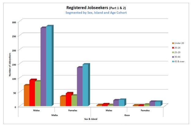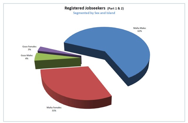 1.7 Registered Jobseekers data as at February 2026The following charts will provide a brief analysis of the registered unemployed pool registered with Jobsplus as at the end of February 2026 (last published information by the National Statistics Office). All information is segmented by Gender and Island for ease of reference. |