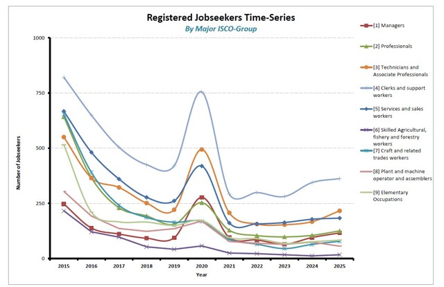 1.3 Registered Jobseekers segmented by Occupation (2015-2025)The majority of jobseekers registering with Jobsplus are looking for jobs as Clerks and support (26%); followed by those looking for Service workers and shop/market sales workers jobs (16%); Technical and Associate Professionals (15%); Professionals (11%); Craft and related workers jobs (9%); Elementary jobs (8%); Plant and Machinery Operations and Assemblers (7%) and Managers (7%). Over the past decade, registration of jobseekers in Skilled Agricultural, Fishery and Forestry jobs are quite low. In fact, those looking for Skilled Agricultural, Fishery and Forestry jobs amounted to 3%.