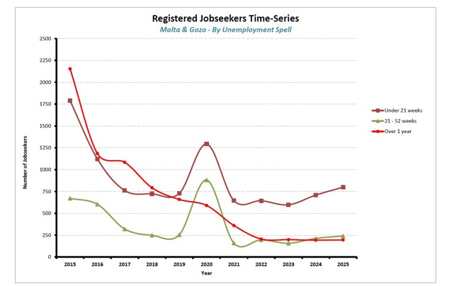 1.5 Registered Jobseekers segmented by Duration of unemployment spell (2015-2025)Over the past decade, there was a registered shift from those jobseekers (registered with Jobsplus) having an unemployment spell of over 1 year. In fact, the share of those having an unemployment spell over 1 year reduced from 47% to 16% over the past decade, whilst for those having an unemployment spell of 21-52 weeks there was not a significant change over the past decade (from 15% to 19%). Those jobseekers having an unemployment spell of Under 21 weeks had an average share of 50% of total registered jobseekers. . |