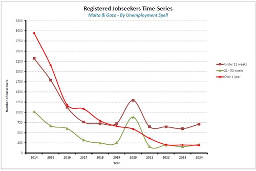 1.5 Registered Jobseekers segmented by Duration of unemployment spell (2014-2024)Over the past decade, there was a registered shift from those jobseekers (registered with Jobsplus) having an unemployment spell of over 1 year. In fact, the share of those having an unemployment spell over 1 year reduced from 47% to 17% over the past decade, whilst for those having an unemployment spell of 21-52 weeks there was not a significant change over the past decade (from 16% to 19%). Those jobseekers having an unemployment spell of Under 21 weeks had an average share of 48% of total registered jobseekers. . |