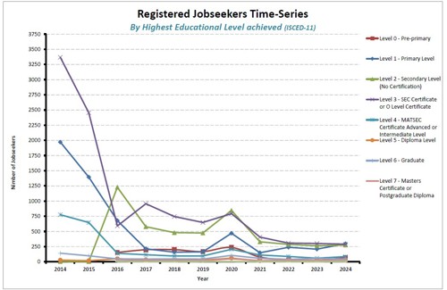 1.4 Registered Jobseekers segmented by the highest educational level achieved (2014-2024)37 % of those jobseekers registering at Jobsplus have an ISCED Level 3 classification, namely those with a SEC or O level certification. Moreover, almost 20% of jobseekers have a primary level of education (ISCED level 1). 14% of jobseekers have an educational level higher than that of an "A" level standard (ISCED level 4 and higher). |