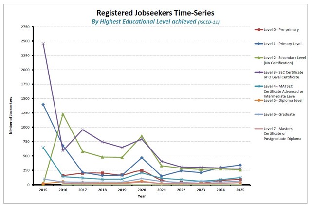 1.4 Registered Jobseekers segmented by the highest educational level achieved (2015-2025)34 % of those jobseekers registering at Jobsplus have an ISCED Level 3 classification, namely those with a SEC or O level certification. Moreover, almost 26% of jobseekers have a secondary level of education (ISCED level 2). 19% of jobseekers have a primary level of education (ISCED level 1). |
